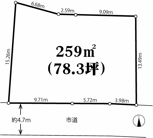 土地と接している道路である接道の幅が15m以上あります。売地をお探しの方に、こちらの土地はイチオシです。土地面積は259㎡となっています。工事自体も進めやすく、工事時間も短くなりやすい平坦地です。何度も経験するわけではない不動産購入は、深い専門知識も必要になる場面があります。知識と経験豊富な当社スタッフが、お客様の不動産探しをサポートし、不動産購入に関する疑問にも適切にお応えいたします。